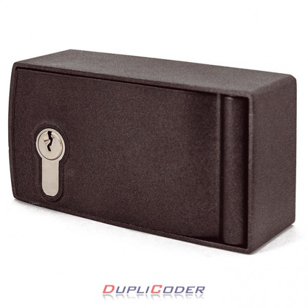 Caja blindada para desbloqueo de electrofreno de motor puerta enrollable, con pulsador y cilindro de perfil europeo con llave serreta.