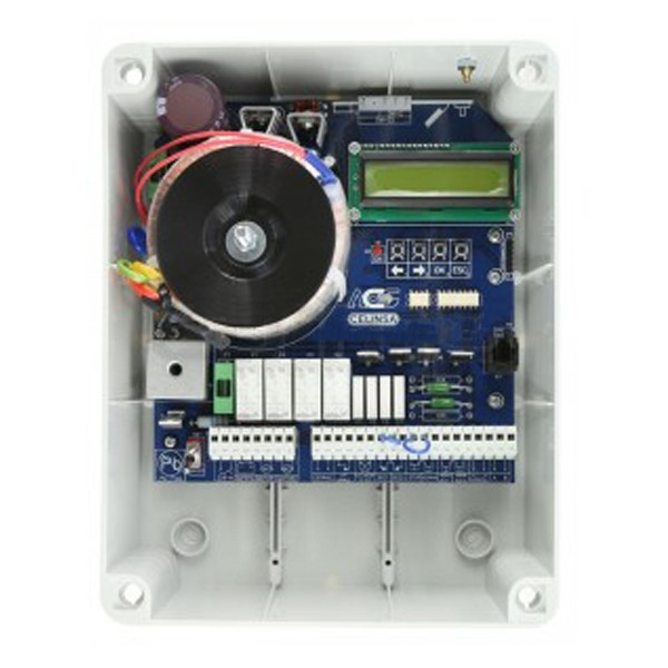 Cuadro de control especialmente diseñado para puertas batientes de una o dos hojas de uso residencial con motores de corriente continua de 12Vcc o, bajo previo pedido, de 24Vcc.