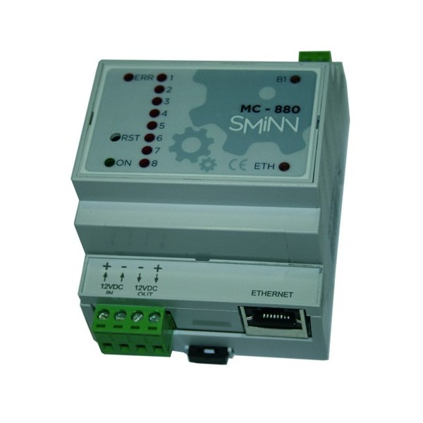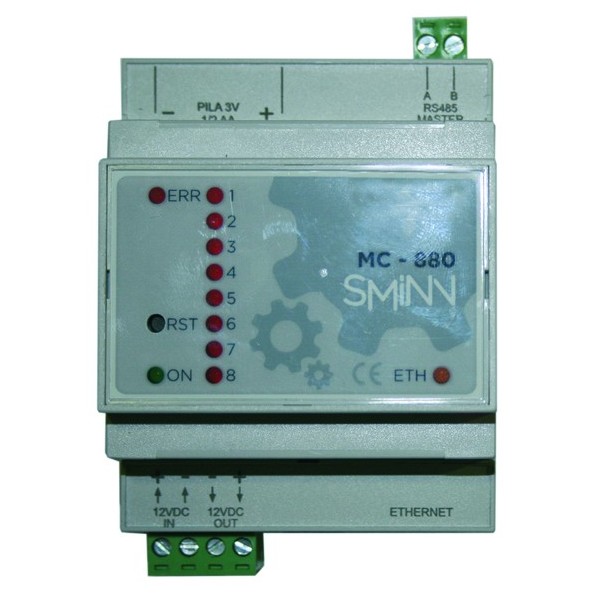 MC 880 es el corazón del sistema de control de accesos en red. Es configurable para trabajar en modo autónomo mediante reglas de calendario o en modo esclavo. La programación y configuración se realiza a través de TCP/IP con un PC.