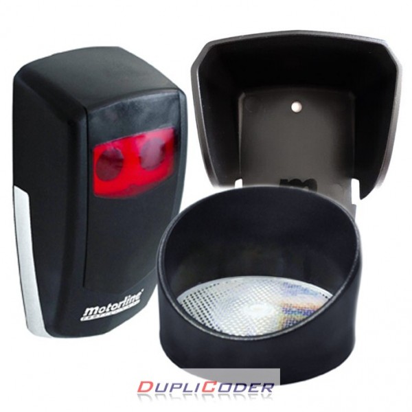 Fotocélula de reflexión MOTORLINE con filtro poralizado, alcance 15 mtrs.12/24 V., según el tipo de reflector Insensible a las fuentes de luz externas, con espejo, protector de fotocélula y espejo