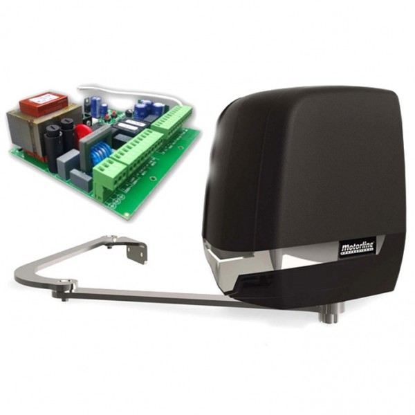 Motor batiente electromecánico articulado MOTORLINE 230 v. para puerta hasta 4 mtrs (según peso de la puerta) con caja de hierro galvanizado. Incluye brazo articulado. Con bloqueo en hojas de hasta 2,5 mtrs. Con cuadro de control MC2.
