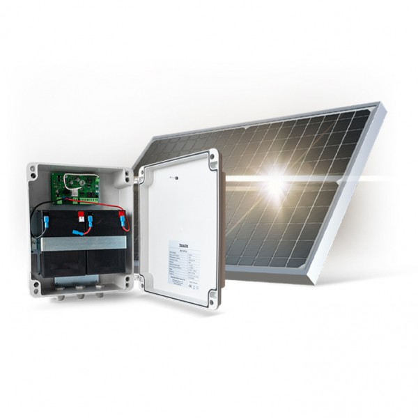 KIT sistema alimentación solar MOTORLINE para motores 24 V. , incluye 1 panel solar MSP30-72A, 1 central electrónica MCHSOLAR, 2 baterías MBAT12-12AH y soporte fijación panel solar.