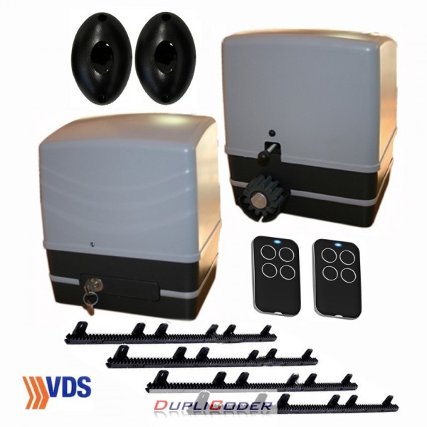 Kit motor VDS SIMPLY electromecánico irreversible, 230 Vac, 600 Kg. con cuadro de maniobra, receptor incorporado, fotocélula, 4 metros de cremallera de nylon y 2 mandos, para puerta corredera de uso residencial, final de carrera electromecánico.